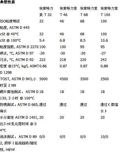 埃索特力索 T 32-100 是一种高质量的涡轮机及循环系统润滑油,广泛适用于各种工业用途。该产品系列用于汽轮机、轻型固定式燃气轮机以及循环系统. Teresstic T 32-100油品经过多年来不断改进,采用精选基础油和高效添加剂配制, 括抗氧化剂、 防锈添加剂及和腐蚀抑制剂以及抗泡剂。 埃索特力索 T 32-100 有四种粘度等级,从ISO VG 32 到 100。埃索特力索T 32 和 46用于要求具有出色氧化稳定性、防锈保护及综合特性(如具有良好的空气释放性、低泡沫倾向和快速空气分离)优质润滑油的涡轮机应用。