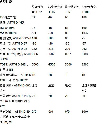 埃索特力索 T 32-100 是一种高质量的涡轮机及循环系统润滑油,广泛适用于各种工业用途。该产品系列用于汽轮机、轻型固定式燃气轮机以及循环系统. Teresstic T 32-100油品经过多年来不断改进,采用精选基础油和高效添加剂配制, 括抗氧化剂、 防锈添加剂及和腐蚀抑制剂以及抗泡剂。 埃索特力索 T 32-100 有四种粘度等级,从ISO VG 32 到 100。埃索特力索T 32 和 46用于要求具有出色氧化稳定性、防锈保护及综合特性(如具有良好的空气释放性、低泡沫倾向和快速空气分离)优质润滑油的涡轮机应用。