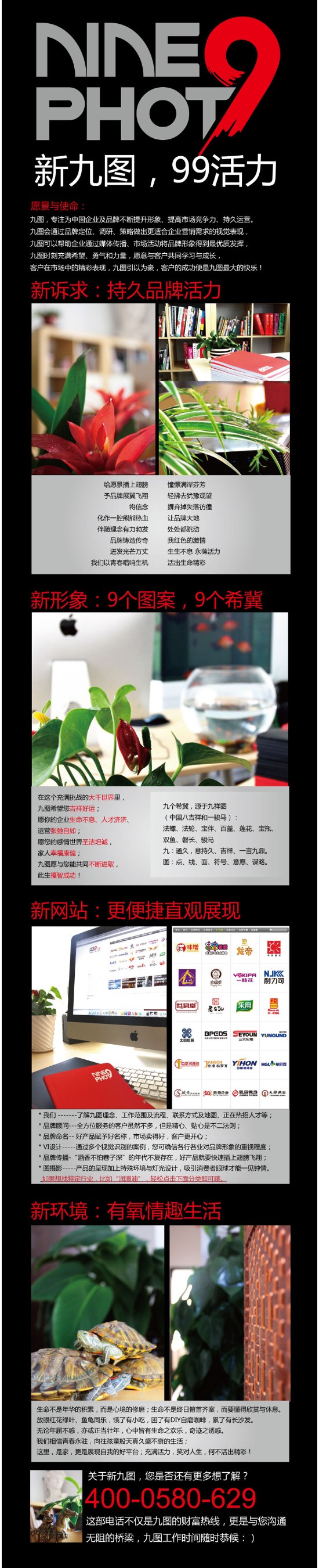 始终专注于品牌形象提升,但同时也一直在思考,如何才能更好的服务客户,如何帮助品牌持续运营….如今,面对竞争密布的前路,还有多少人会记得品牌的初心?只有唤醒沉睡的企业,品牌才有可能更加持久的发展,焕发无限激情。九图在2013的全新变化表示,我们要奉献出满载活力的作品吸引消费者,让品牌始终鲜活存在;同时九图也要用自己的赤诚走出一条充满生命精彩的道路,携手更多的客户一起迈向成功。新诉求、新形象、新环境、新网站,跳动的激情在血液中喷张,这就是活力的绽放、青春的跃动。不管是逆水行舟,又或负重捆绑,九图都愿与客户一起,激发品牌潜力,羽化升飞。