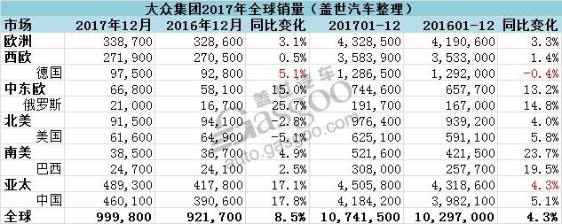 2017年,大众集团在欧洲共售出432万辆新车,同比增长3.3%,而俄罗斯市场的复苏对整个中东欧的销量增长做出了较大贡献。去年12月份,大众集团在俄罗斯的销量同比劲增25.7%,达21,000辆。大众集团去年在中国市场的交付量接近420万辆,约占其全球销量的四成;在去年的*后一个月,大众集团在华共交付460,100辆新车,同比增长17.8%。在北美地区,大众集团共交付976,400辆新车,同比攀升4%。尽管2017年美国车市销量整体下滑1.8%,但是大众集团依然在该地区取得了5.8%的销量增长,共在美国交付625,100辆新车。