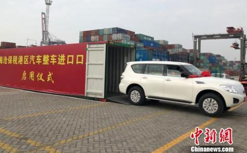 图为进口汽车驶出集装箱柜。 陈悦 摄