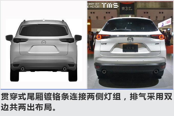 CX-8是马自达旗下一款全新中大型SUV,于去年10月25日开幕的东京车展中首发,内部采用6/7座布局。近日,网上车市获得了马自达国产CX-8的专利图,新车外观造型与海外版车型一致,整体设计与现款CX-5相似,但加长了C、D柱之间的距离,上市后将与福特探险者等中大型7座SUV展开竞争。