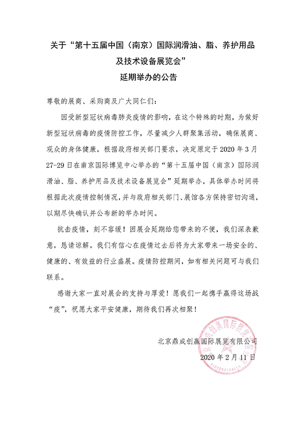 因受新型冠状病毒肺炎疫情的影响,根据政府相关部门要求,“第十五届中国(南京)国际润滑油、脂、养护用品及技术设备展览会”将延期举办,具体公告如下: