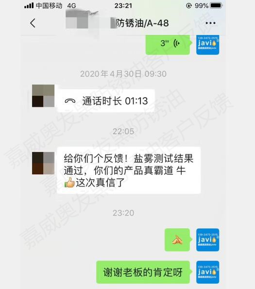 看到客户这样简单粗暴的反馈,顿时成就感爆棚,有木有?有时候解决问题的满足感比赚去利润更让人有成就感。客户担心我们桶装的和样品结果有出入,所以他拿这个桶装的也依然是在测试嘉威奥发黑防锈油的盐雾测试的表现。而且之前一直价格原因在纠结,现在用出了效果,他亲身感受到物有所值,这个霸道的发黑防锈油,完全值这个公道的价格。很多没有用过嘉威奥发黑防锈油的客户,一听说价格就说贵。而用过的客户90%以上都没说价格贵。如果您只在乎价格,就不要对质量有要求。对质量没有要求的客户,请去麻烦我们的同行。嘉威奥发黑防锈油,喜欢那些对质量有要求,尤其是有高要求的客户。