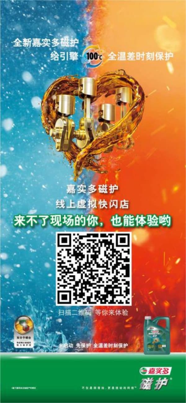为了让广大消费者身临其境感受嘉实多磁护100°C全温差时刻保护的实力,嘉实多此次于9月25日至9月27日在无锡滨湖万象城特别设立了嘉实多磁护全温差快闪店,炫酷的现场感官布置和高科技的AR体验带领消费者揭开全温差时刻保护的秘密,在冰与火的试炼中给引擎时刻贴心守护。虽然线下快闪店已经如期结束,但为了照顾不能到现场体验的朋友们,嘉实多还设立了线上虚拟快闪店,感兴趣的朋友们可以扫描下方海报中的二维码,即刻体验嘉实多磁护线上虚拟快闪店,更多惊喜好礼等着你!