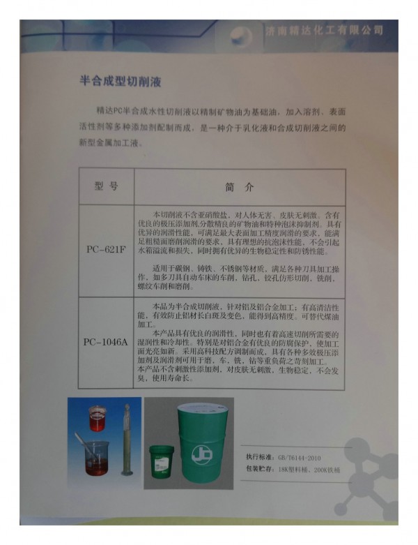 本公司生产的切削液由多种超强功能助剂经科学配比而成,具备良好的冷却性能、润滑性能、防锈性能、除油清洗功能、防腐功能、易稀释特点。克服了传统化油、乳化液。夏天易臭、冬天难稀释、防锈效果差的的毛病,对设备也无不良影响,适用于黑色金属的切、磨、钻、车等加工,属当前***的专业产品。