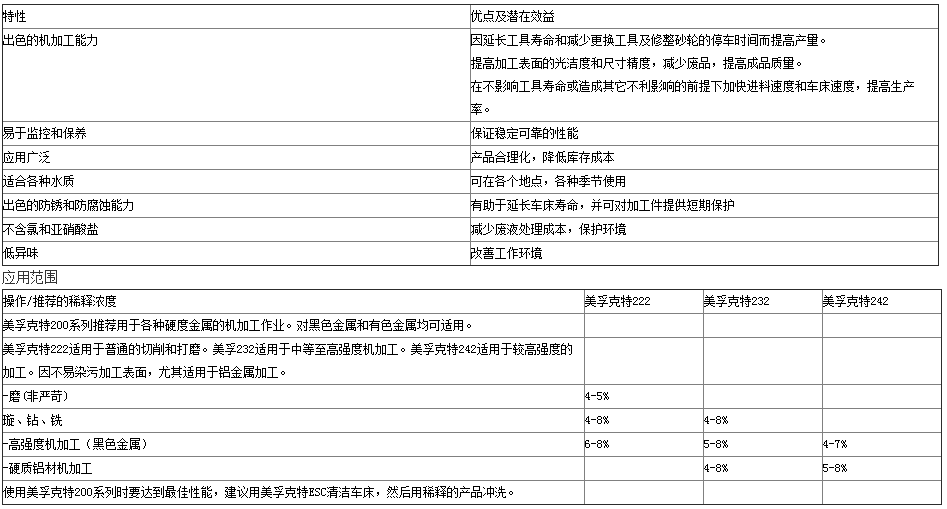 美孚克特200系列水溶性切削液多年来因性能出色而声誉卓著。它们具有多功能机加工及润滑能力。美孚克特200系列的特点和潜在优点包括: