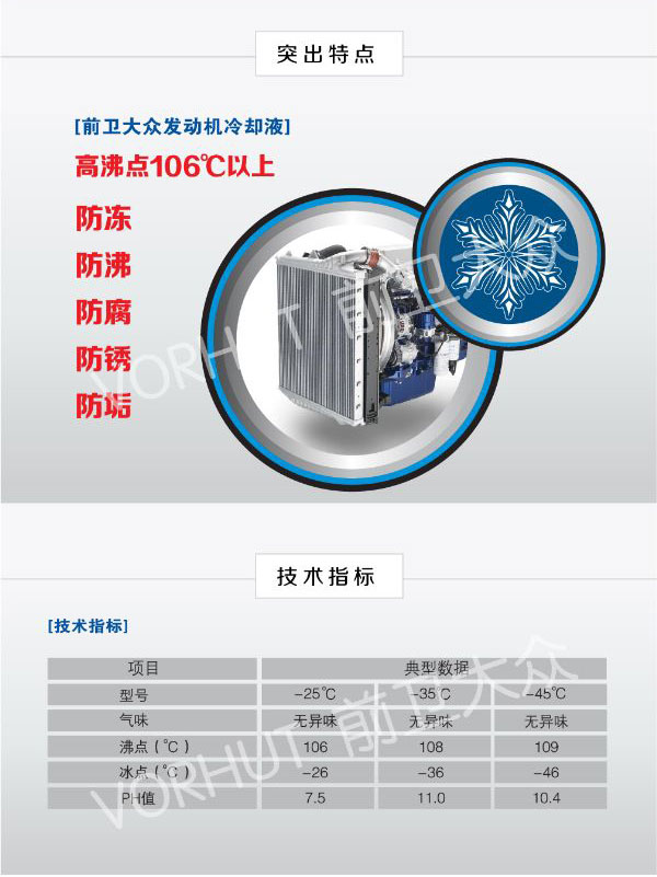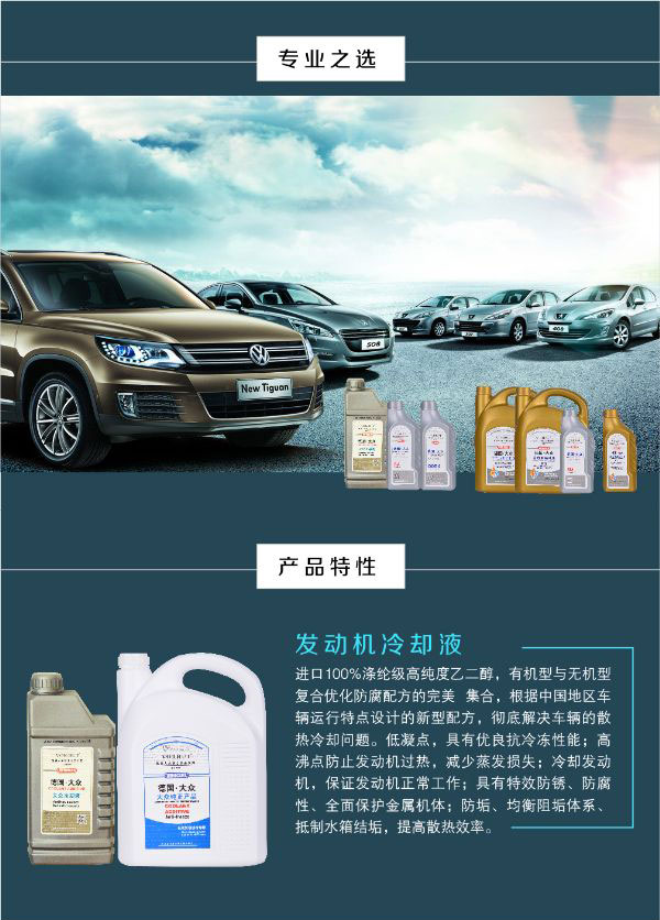 ? ? ? 进口100%涤纶级高纯度乙二醇,有机型和无机型复合优化防腐配方的**集合,根据中国地区车辆运行特点设计的新型配方,彻底解决车辆的散热冷却问题。低凝点,具有优良抗冷冻性能;高沸点防止发动机过热,减少蒸发损失;冷却发动机,保证发动机正常工作;具有特效防锈、防腐性、全面保护金属机体;防垢、均衡阻垢体系、地址水箱结垢,提高散热效率。