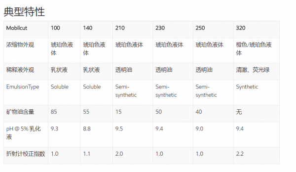 Mobilcut 250: 半合成的切削液主要用于铝及铝合金的加工。 亦可用于一系列铁材料的加工,该类加工需要较为通用的加工液。