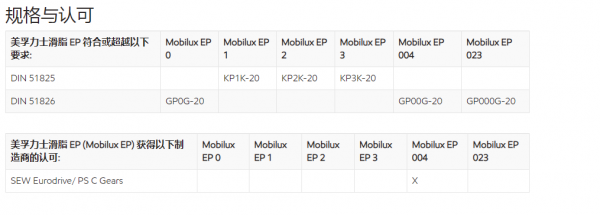 美孚力士滑脂 EP系列 0, 1, 2, 3, 004 和 023 是一系列高性能润滑脂,其中的四种为通用工业润滑脂, 两种为专用 半流体润滑脂。 这些羟基硬脂酸锂基润滑脂具有超级抗磨、防锈蚀和抗水冲洗等保护性能。它们分为 NLGI 00 级至 3 级,基础油粘度为 ISO VG 150 和 320。