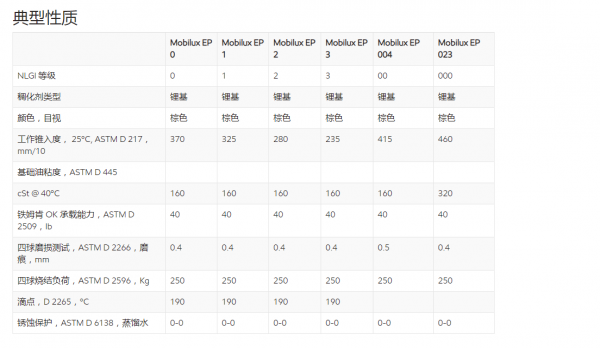 长久以来,美孚力士滑脂 EP 系列 润滑脂被公认为具有高性能,在防腐蚀保护、低温泵送性及高温使用寿命上展示了良好的性能。40 磅的铁姆肯 OK 承载能力说明了它们具有良好的承受载荷和极压的能力。