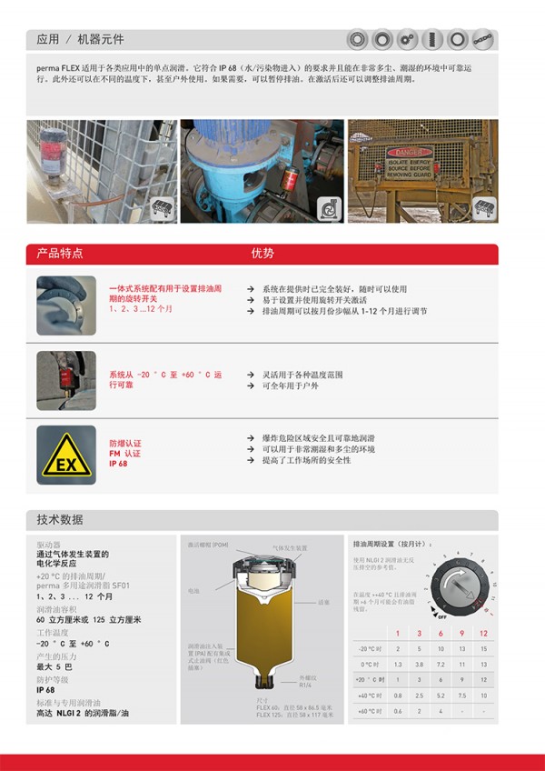 这些系统可用于温度范围在 –20 °C 到 +60 °C 内的各种类型应用中(FLEX PLUS: +55 °C)。排油周期设置可在 1 到 12 个月之间自由调整。所需的*高 5 巴的压力则采用电子控制下的化学反应来建立。在整个选定的排油周期,不断向润滑点提供清洁干净的润滑油。