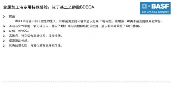 1.抗菌 BDEOA完全不利于微生物生长,在细菌滋生的环境中显示超强PH稳定性,能增强三嗪类杀菌剂的抗真菌效能。