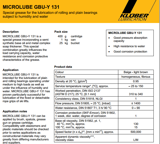 \MICROLUBE GBU-Y 131是滚动轴承和滑动轴承润滑的专用润滑脂、一种半的与一个特殊的金属复合皂稠化的基础润滑脂。 这是这块肥肉更高的负载,防水功能,同时还具有良好的抗腐蚀特性。