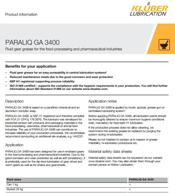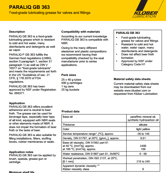 PARALIQ GB 363阀门及配件用食品级润滑脂具有高附着力和啤酒泡沫是中性的。 它也显示了良好的抗水和水蒸汽。