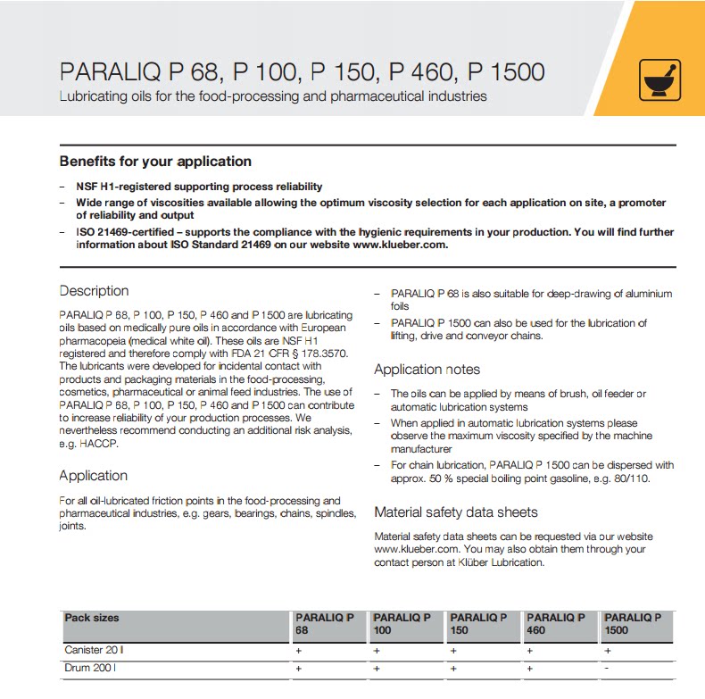 PARALIQ P 68,P 100,P 150,P 460和P 1500是润滑的