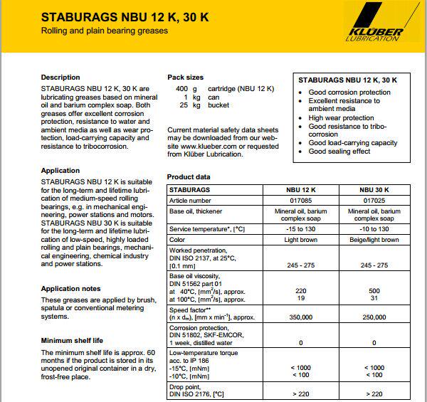 STABURAGS NBU 12 K,30 K滚动轴承和滑动轴承润滑脂基于矿物油和钡的复合物。 在这两种脂肪的很好的抗腐蚀保护是至关重要的。 此外有STABURAGS NBU 12 K和30 K的一个非常好的水和耐化学性,和设计方面磨损和承载属性。 他们还对微动腐蚀有很好的效果。