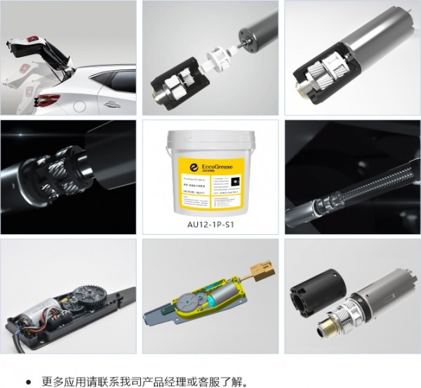 汽车尾门电动撑杆主要由减速电机、承重弹簧、传动丝杆等部件组成,良好的润滑对整个撑杆的寿命和性能起到至关重要的作用。埃科润滑脂EccoGrease AU12-1P-S1高温不易稀化的聚脲化合物稠化非扩散合成油,并加有极压抗磨、yang、抗腐蚀等添加剂制而成低温低摩擦齿轮润滑脂耐高长寿命润滑脂设计用于塑料与塑料、塑料与金属、金属与金属齿轮摩擦部件的润滑,具有se低起动力矩、低温、耐磨性和消音性。