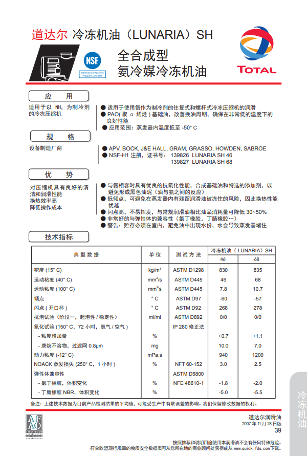 道达尔冷冻机油,TOTAL Lunaria SH 46