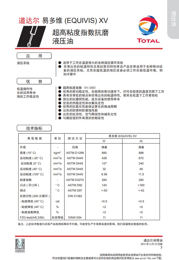 道达尔EQUIVIS XV 32高粘度指数抗磨液压油液压油