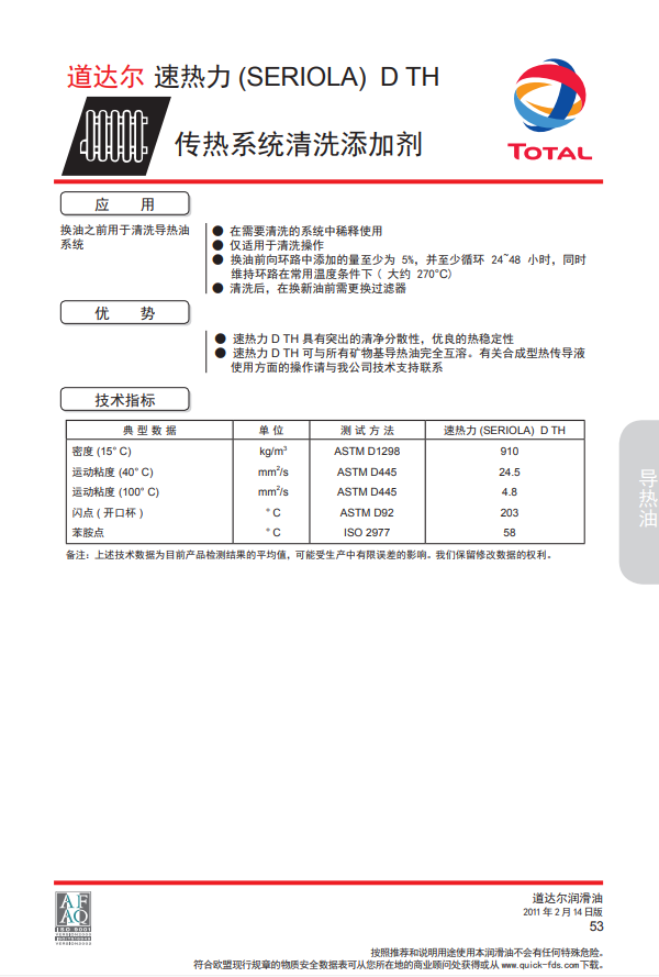 道达尔传热系统清洗添加剂在换油之前用于清洗导热油系统,稀释在需要清洗的系统中的流体中使用;仅适用于清洗操作;换油前向环路中添加的量至少为5%,并至少循环24~48小时,同时维持环路在常用温度条件下(250oC或更高);在换新油前需更换过滤器。