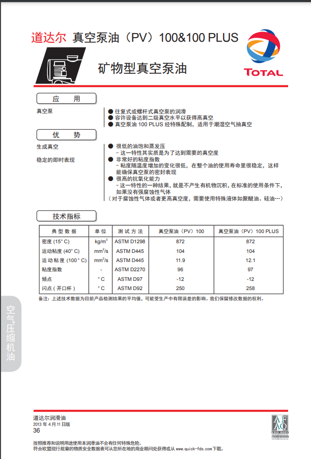 道达尔矿物型真空泵油、TOTAL PV 100-100 PLUS