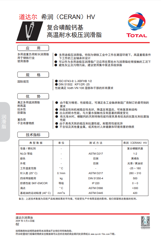 道达尔复合磺酸钙基高温耐水极压润滑脂TOTAL CERAN HV多用途极压润滑脂,特别为钢铁工业中工作在潮湿环境下,高温重载条件下工作的工业轴承所设计
