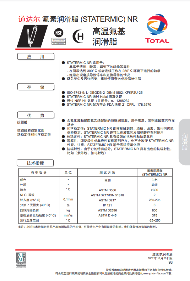 道达尔高温氟基润滑脂TOTAL STATERMIC NR 高温氟化物润滑脂