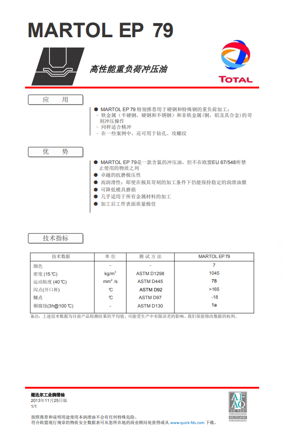 > MARTOL EP 79是一款含氯的冲压油,但不在欧盟EU 67/548所禁止使用的物质之列。