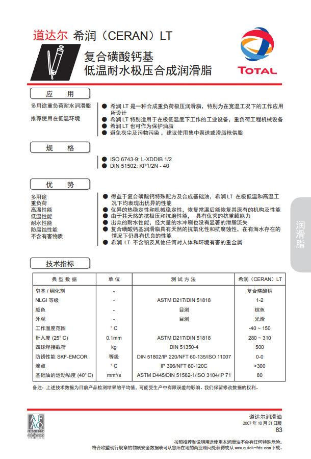 道达尔LT低温合成润滑脂 TOTAL CERAN LT复合磺酸钙极压润滑脂