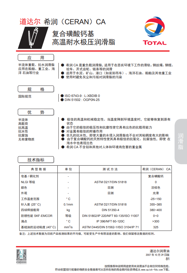 希润 CA 是重负载润滑脂,适用于在恶劣环境下工作的滑轨、钢丝绳、钢缆、绞车、开式齿轮、链条等的润滑。