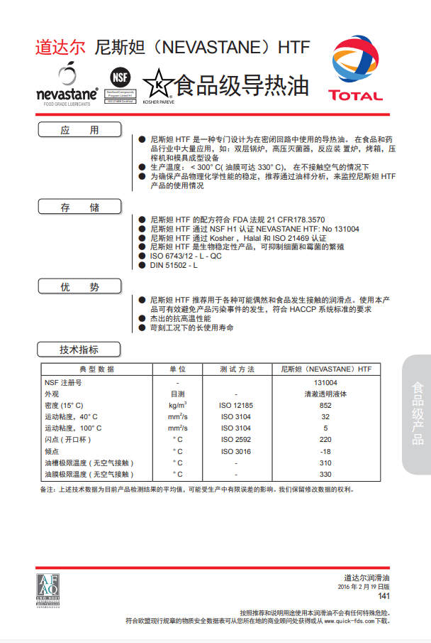 > 尼斯妲 HTF 推荐用于各种可能偶然和食品发生接触的润滑点。使用本产品可有效避免产品污染事件的发生,符合 HACCP 系统标准的要求。