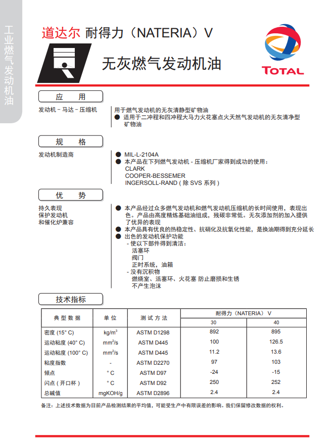 道达尔耐得力TOTAL NATERIA V30燃气发动机油