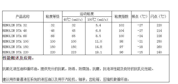 福斯RENOLIN DTA 32 46 68 100 150 品质液压油是抗氧化液压油和循环油。提供充分的抗氧,防锈、防腐蚀、抗磨,抗泡沫性能及良好的抗乳化性能。建议用作普通液压系统的液压油以及用 于汽轮机、轴承,齿轮箱、压缩机做循环油。