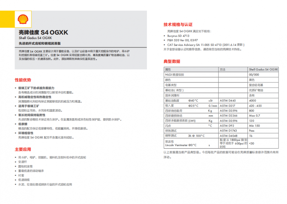 壳牌Gadus S4 OGXK主要设计用于非常重的应用,以及严重的操作寒冷天气条件,采矿设备,铲子,拉铲挖掘机和开挖操作中的挖掘机。