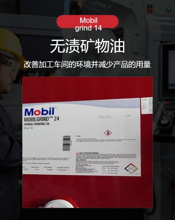 Mobilgrind 14(美孚格兰德 14)可以用于碳钢和合金钢的轻型外圆磨削和平面磨削。 Mobilgrind 14(美孚格兰德 4)选用优质添加剂和基础油,减少磨削时的起雾现象并保持粘度。此外,它还帮助在精密磨削中保持精确度。 该产品粘度低,可使磨削粉末快速从油中沉淀出来,帮助过滤以便油品可以在循环系统中重复使用。