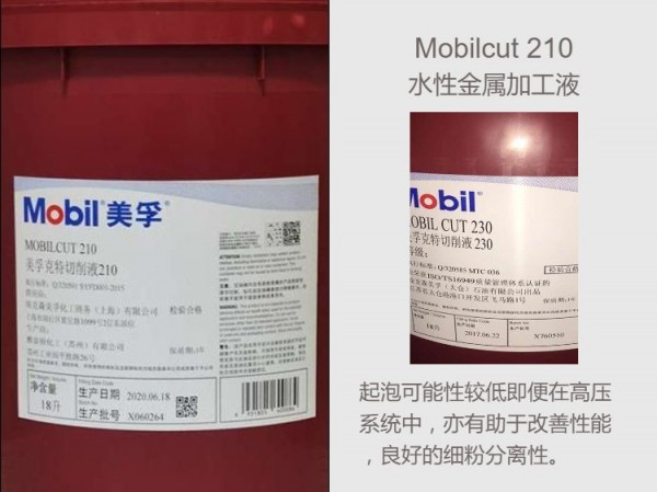 Mobilcut 是美孚高性能水溶性金属切削液产品线的商标。 Mobilcut 系列无氯产品采用先进的基础油、添加物和乳化剂,为多种金属切削工艺提供可靠性能。 该产品设计成可在多种硬水和软水中运行,不易起泡,可长期抵抗机器和零件腐蚀。Mobilcut 产品具有较低的维护频率和内在稳定性,旨在为以产品具备较长的使用寿命、##的加工性能和健康环保问题为提高生产力的重要因素的现代化车间而设计。 这类产品以浓缩液形式提供,使用前需要与水混合。
