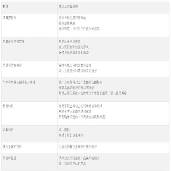 这些产品采用创新技术来获得低摩擦特性,帮助确保先进的高速机床能加工出高产量的合格部件,并且停机时间少。它们可以阻止导轨和液压系统中出现氧化和形成漆膜与沉积物,同时提供出色的承载性能来控制部件磨损,并帮助延长设备使用寿命。