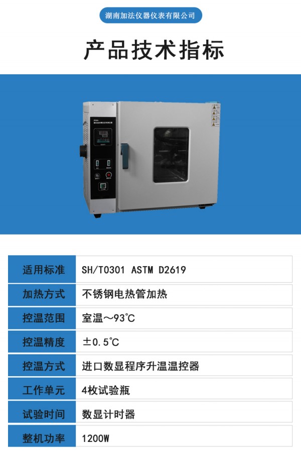 本仪器适用于检测矿油性和合成液压液的水解安定性,也适合评定水基或水乳化的液压液。试验时将试样、水和铜片仪器密封在耐压玻璃中,然后将其放在一定温度的油品水解安定性试验箱内,按头尾颠倒方式旋转48小时后,将油水混合物过滤,测定不溶物,再将油、水分离,分别测定油的粘度、酸值、水层总酸度和铜片质量变化。