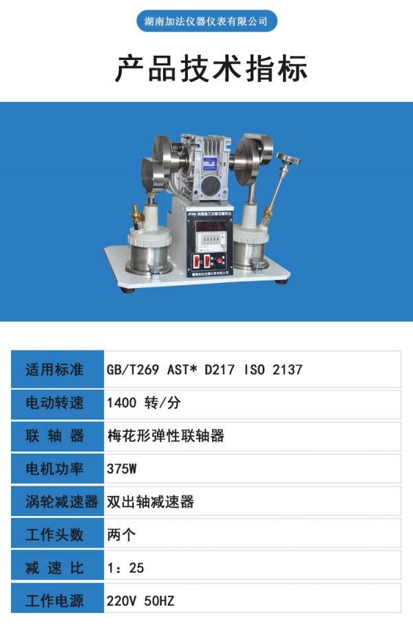 该仪器是评定润滑脂锥入度性能的一种试验设备。在标准规定的试验条件下,对经机械剪切工作后的润滑脂稠度变化进行测定,从而判定润滑脂的机械安定性(用延长工作锥入度或剪切安定性表示,单位为1/10mm)。
