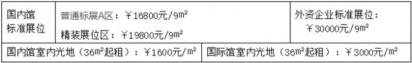 1、标准展位9m2(3m×3m);配置:展出场地、三面展板(高2.5m)、一块中英文楣板 、一 张洽谈桌、二把椅子、地毯、220V电源、二支射灯。双开口位置另外加收10%的参展费用。