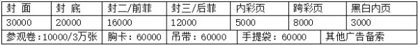 为了配合在展览期间宣传及让客户了解并在会后能与之沟通联系,组委会将编印大会会刊,会刊规格:145mm×210mm.注:广告费用须全额一次付清,以付款先后顺序进行安排。单位:元(RMB)