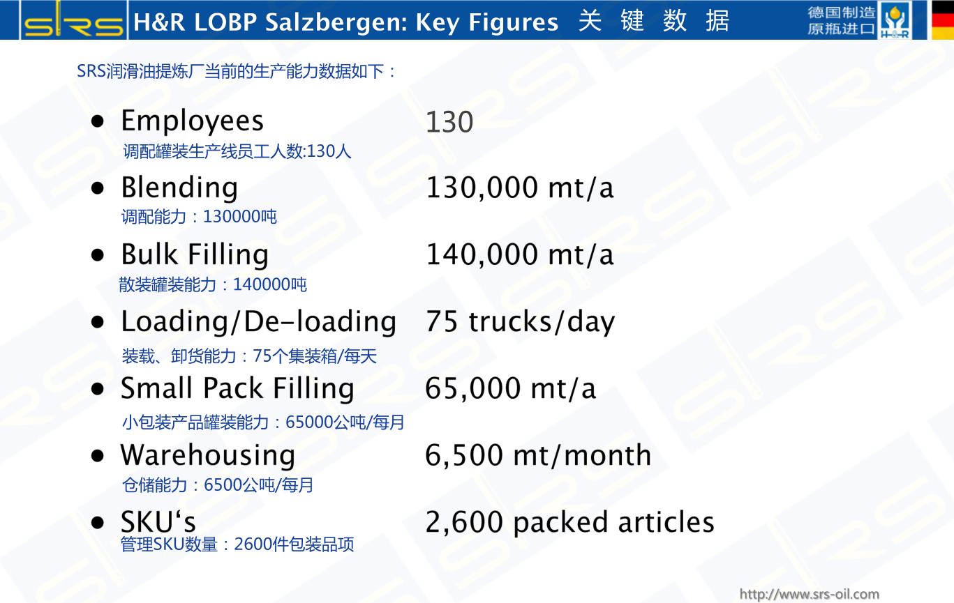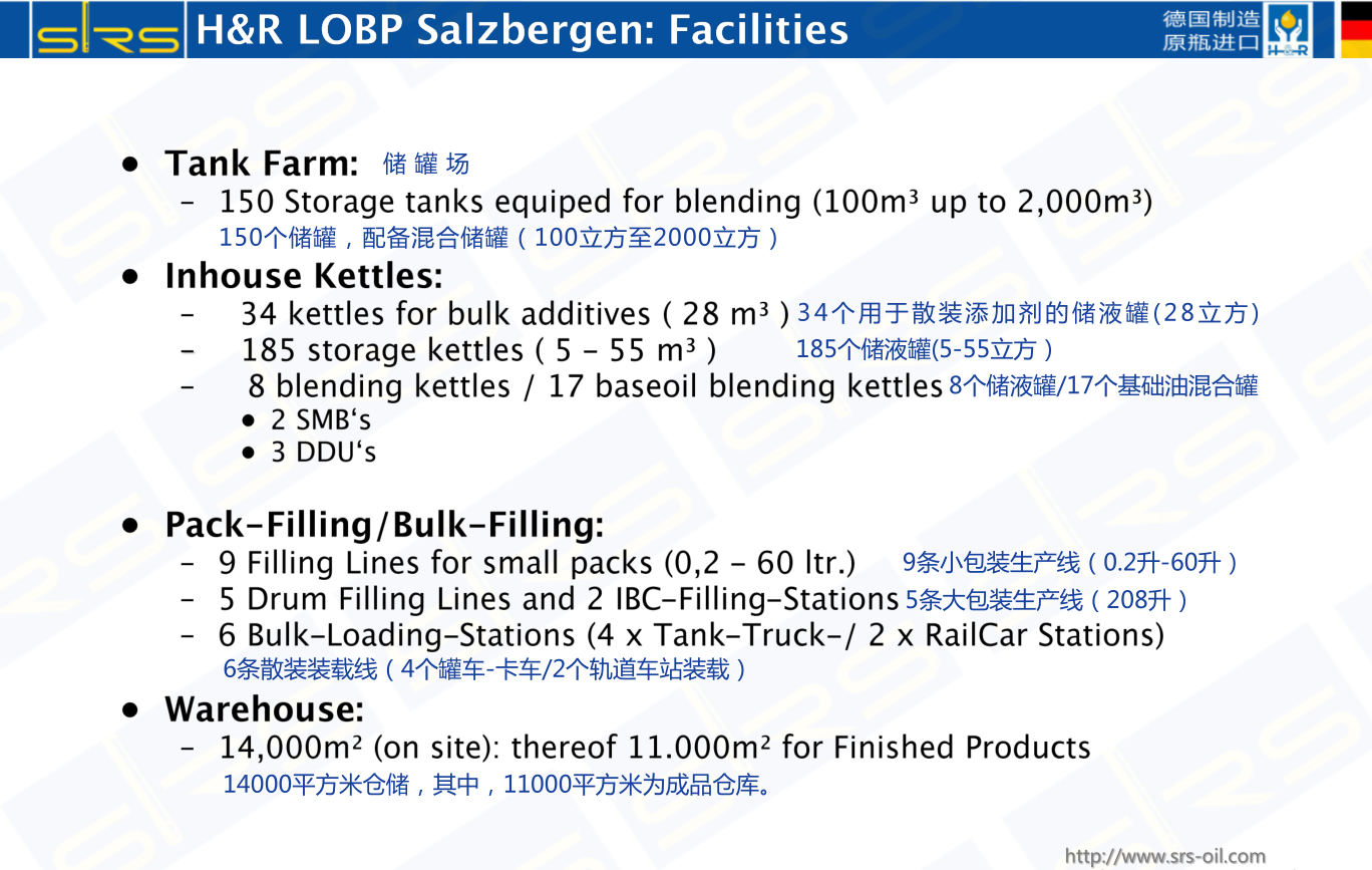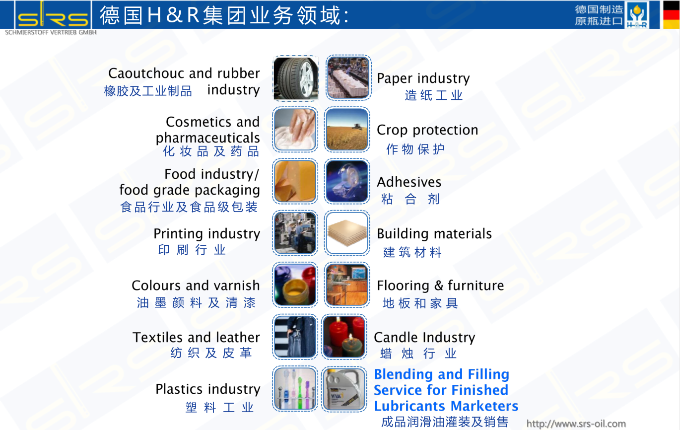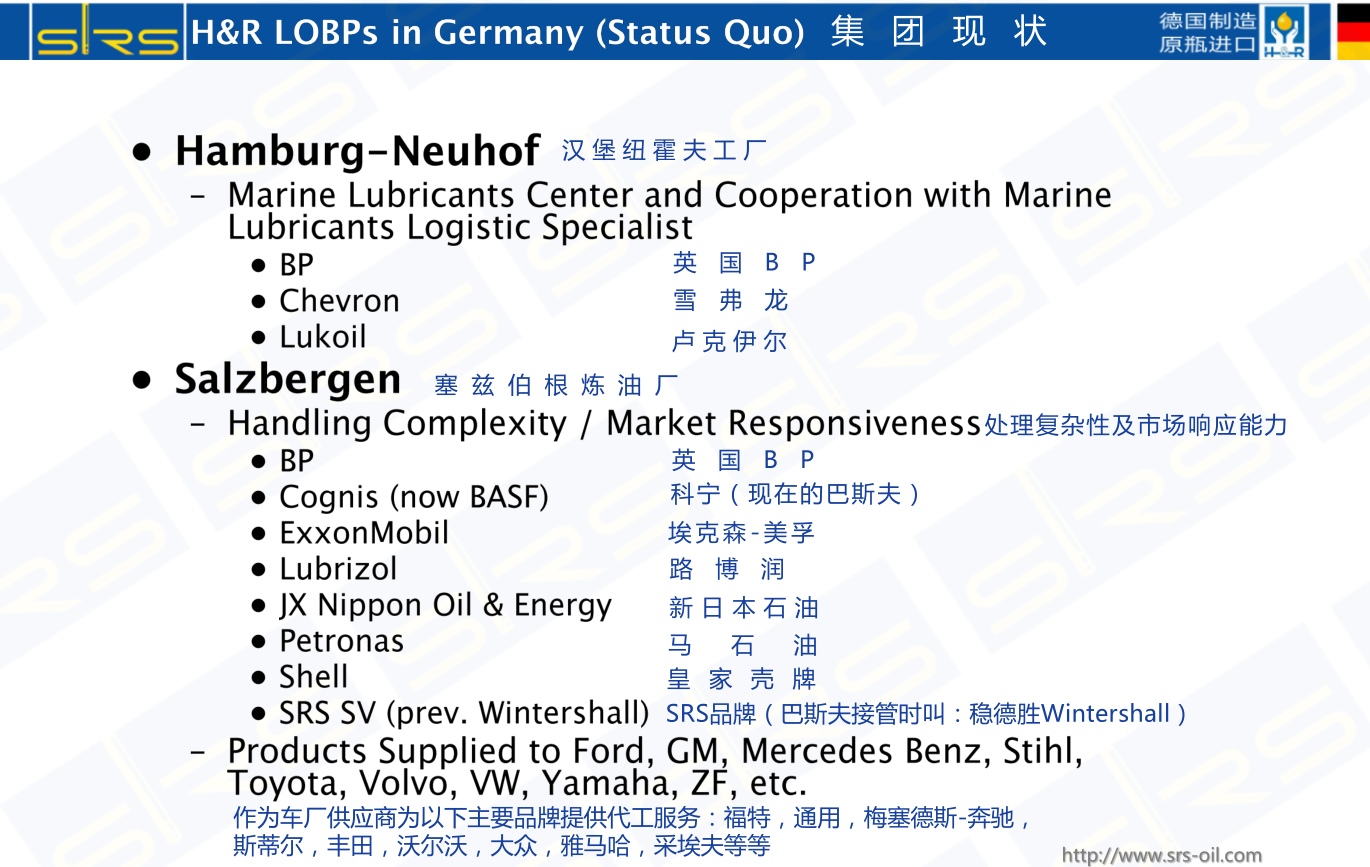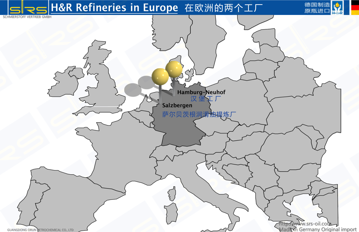 1994年汉森家族旗下德国法兰克福SDAX上市公司德国汉森-罗森塔尔两合公司(H&R)(Hansen&Rosenthal KG) 并购SRS Schmierstoff Vertrieb GmbH Salzbergen炼油厂,SRS成为H&R集团重要成员。SRS业务覆盖成品油,汽车润滑油,工业,航空,医药,食品,建材,化妆品等领域。SRS控制着全球橡胶油和白油70%以上的市场份额.