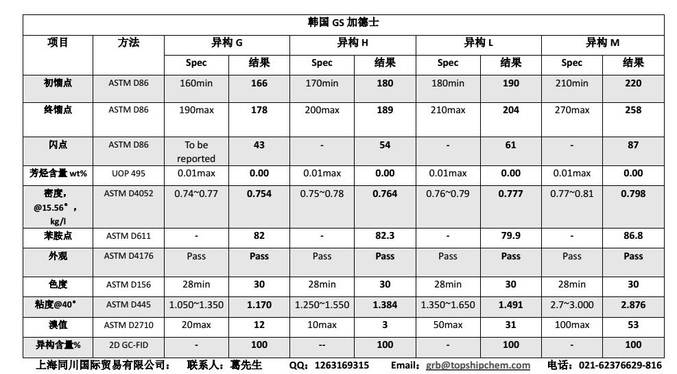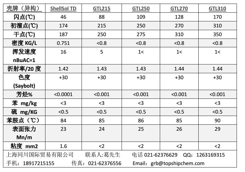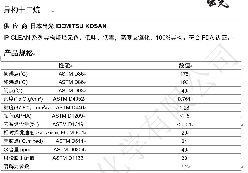 初沸点:174 干 点:187 闪点:46 密度:0.751 粘度:1.6 颜色:+30 芳香烃含量:<0.0001% 相对挥发速度:16 苯胺点:84 适用与下列工业:涂料工业、粘合剂工业、气雾杀虫剂、金属加工润滑